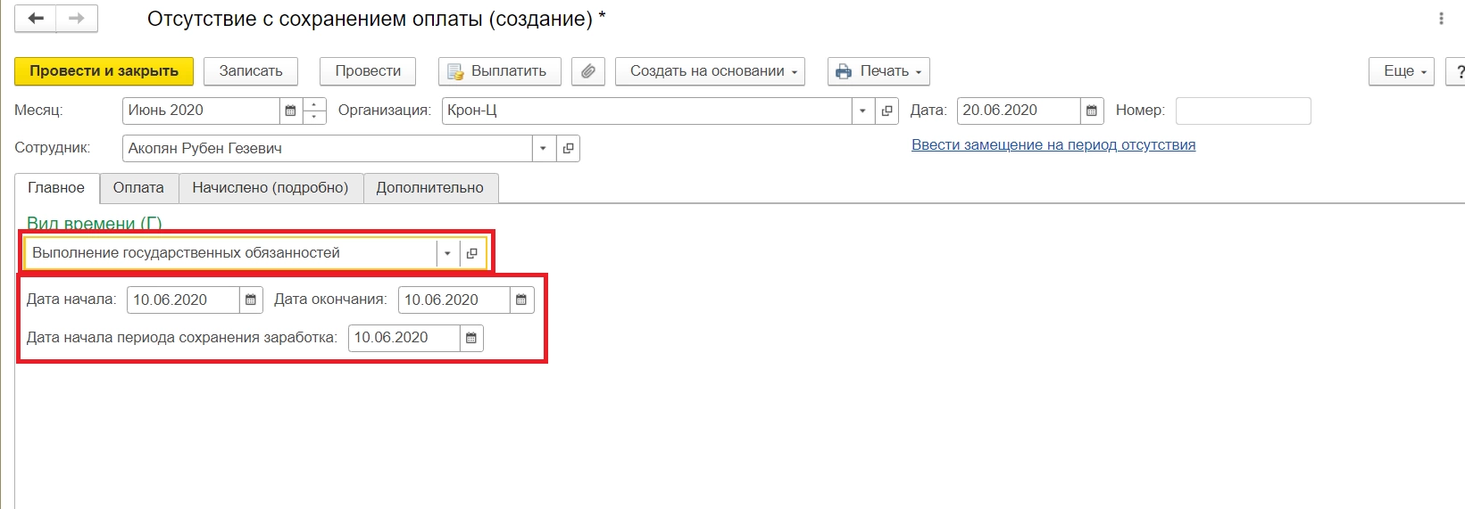 Предположим, что наш сотрудник получил повестку в военкомат для прохождения медицинского осмотра. Медосмотр проводится в рабочее время, соответственно, работник будет отсутствовать на рабочем месте, однако, у него сохраняется средний заработок на этот период. Для отражения этого факта, создаём документ «Отсутствие с сохранением заработной платы».