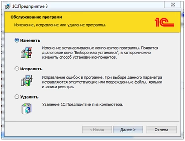 Для этого зайдем в «Панель управления-Программы и компоненты», найдем «1С:Предприятие» и нажмем «Изменить».