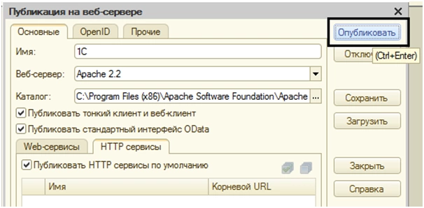 Если возникли проблемы при публикации – вы запустили 1С не от имени администратора.