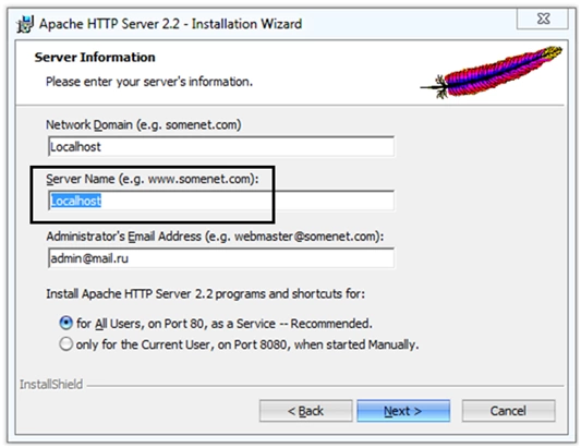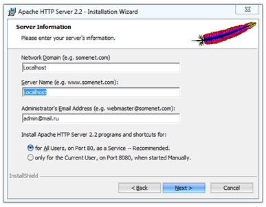 Далее мы указываем информацию о нашем сервере. Если сервер в локальной сети, а у предприятия нет своего домена, указываем любую информацию, и имя сервера – Localhost, что означает, что сервер будет работать на локальном компьютере. В следующем поле заполняем адрес электронной почты, на который будут приходить ответы сервера (у нас произвольный, для примера).