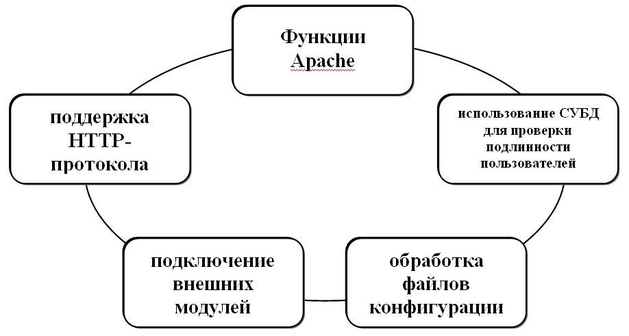 Apache – полнофункциональный, расширяемый веб-сервер с открытым кодом, удовлетворяющий практически все потребности современных веб-разработок. Apache является кроссплатформенным, т.е. поддерживает множество операционных систем – Microsoft Windows, Linux, BSD, Mac OS, Novell NetWare, BeOS. Основные его функции: поддержка http-протокола, возможность подключения внешних модулей, использование СУБД для проверки подлинности пользователей и обработка файлов конфигурации.