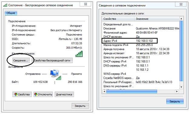 В открывшемся окне выбираем пункт «Беспроводное сетевое соединение», т.е. нашу сеть, и в появившемся окне нажимаем кнопку «Сведения». Там мы видим IP-адрес нашего компьютера в сети. В нашем случае – 192.168.0.102.