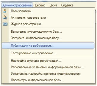 Далее опять запускаем 1С в том же режиме и заходим в пункт меню «Администрирование-Публикация на веб-сервере».
