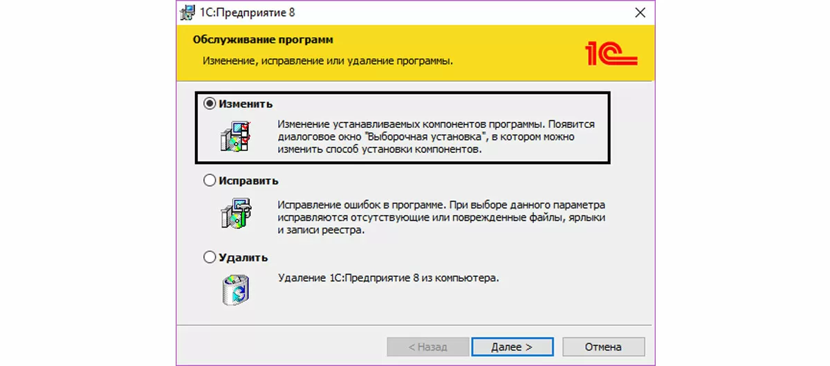 В открывшемся окне оставляем переключатель в положении «Изменить» и нажимаем кнопку «Далее».
