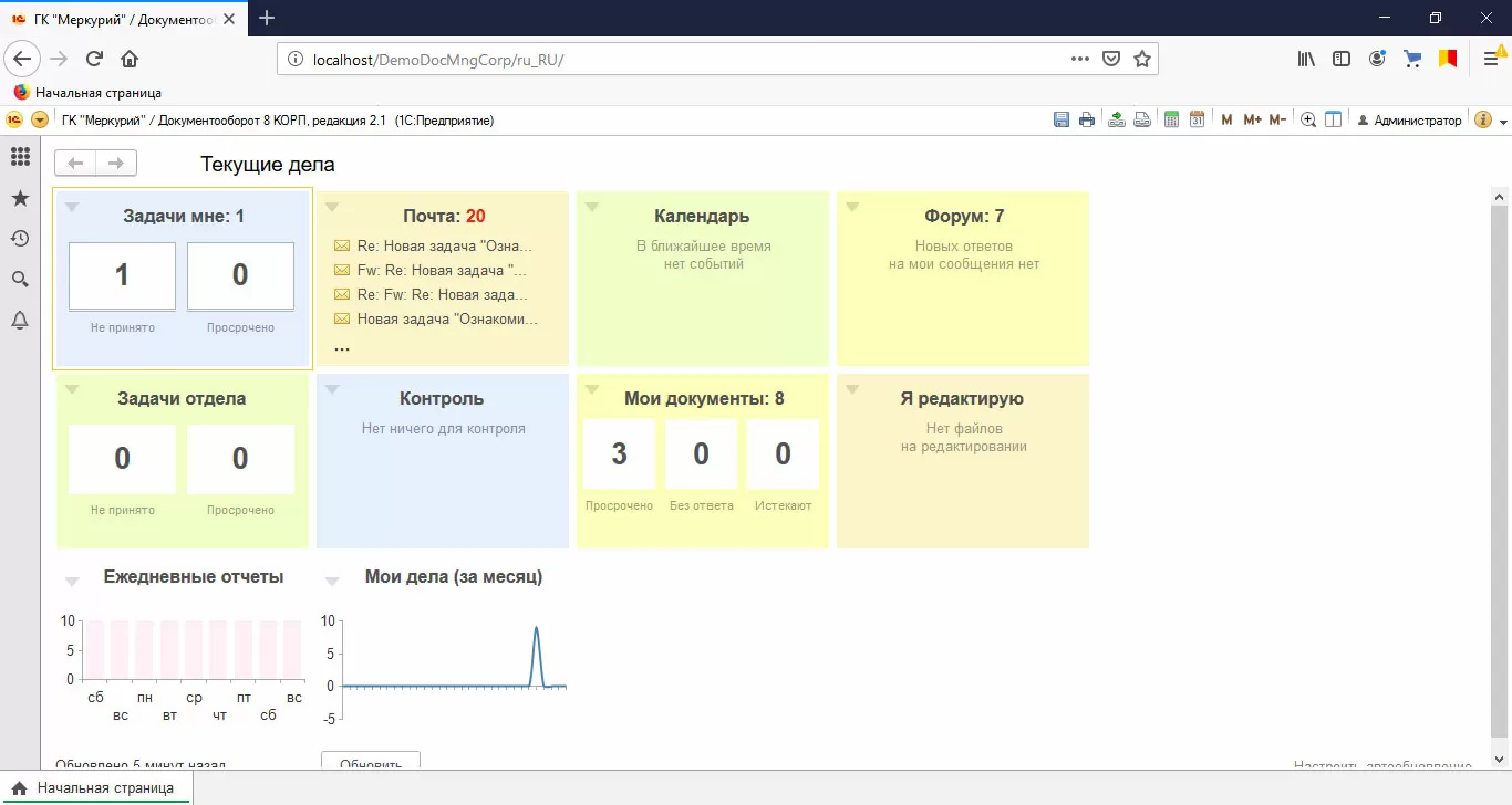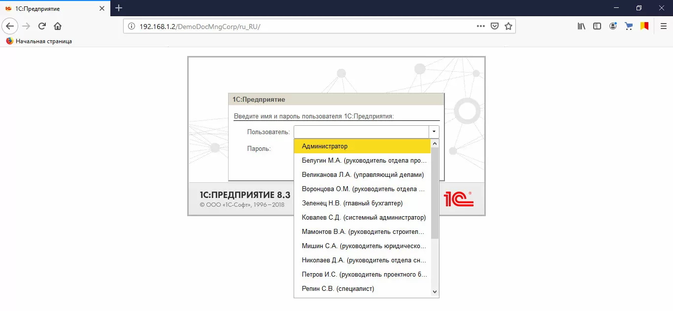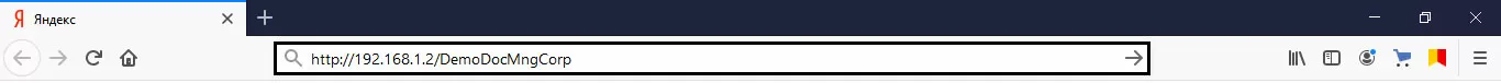 Попробуем открыть информационную базе через IP-адрес – введем в адресную строку http://192.168.1.2/DemoDocMngCorp