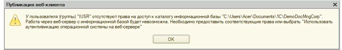 После публикации система сообщит, что у пользователя отсутствуют права на доступ к каталогу нашей базы. Для дальнейшей работы их следует настроить.