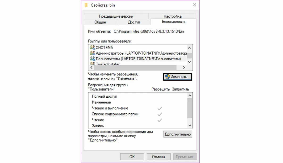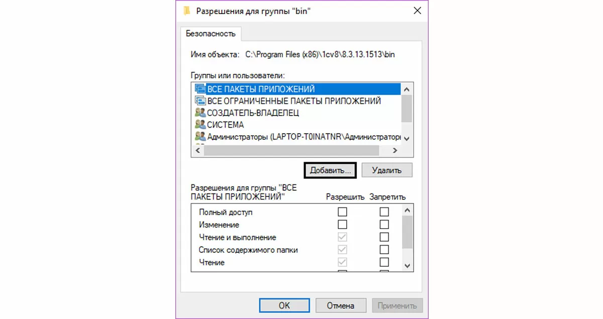 Проделываем аналогичные действия с правами доступа к папке ИБ.