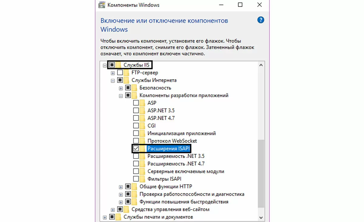 В открывшемся окне включаем «Службы IIS», установив галочку. Значения по умолчанию можно оставить предложенные, но обязательно установить галочку «Расширения ISAPI».
