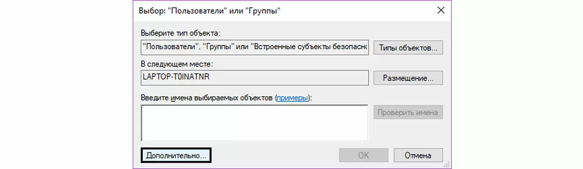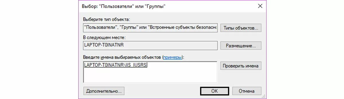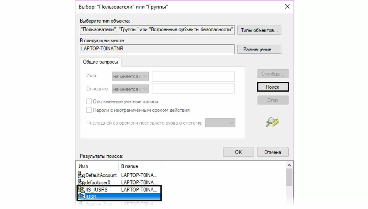 Нажав кнопку «Дополнительно», в дополнительном окне нажмем кнопку «Поиск». В нижней части окна отобразятся пользователи, среди которых выберем IIS_USERS и IUSR.