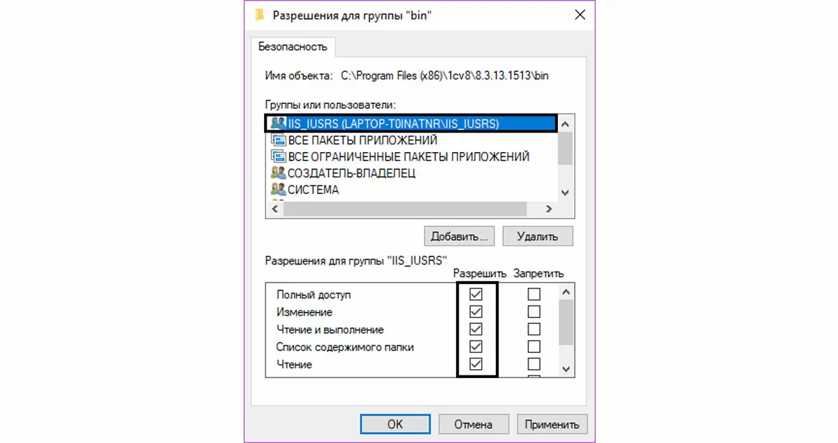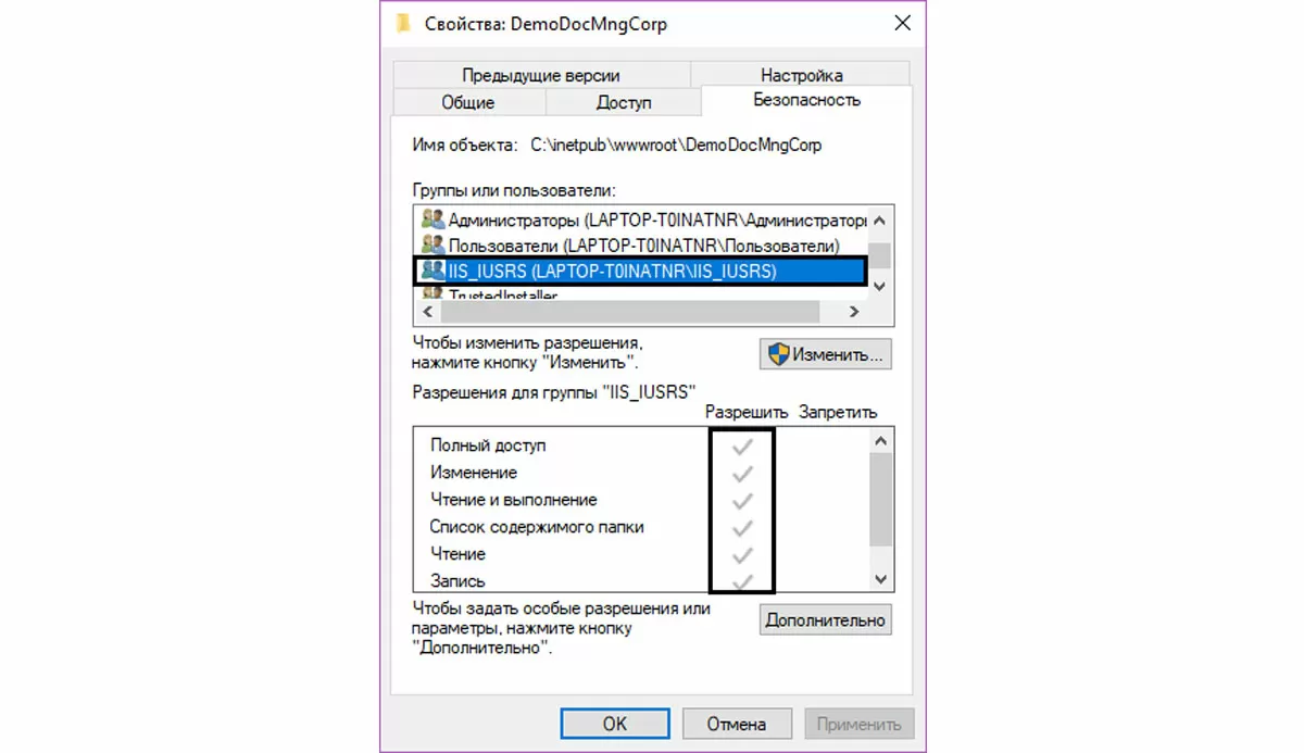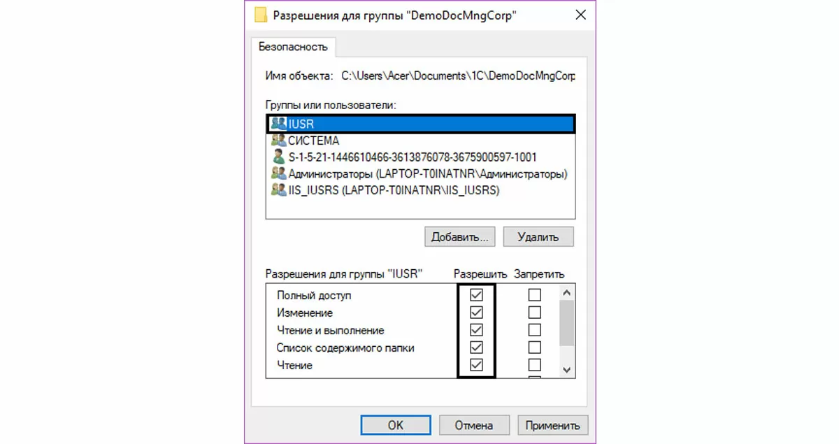 Для работы с информационной базой веб-сервер IIS автоматически создает пользователя IUSR и группу IIS _USRS. Для корректной работы нужно предоставить полный доступ пользователя IIS_USERS к папке Bin, где будет храниться база, используемой платформы и месту расположения каталога информационной базы (в нашем примере – C:\inetpub\wwwroot\DemoDocMngCorp\).