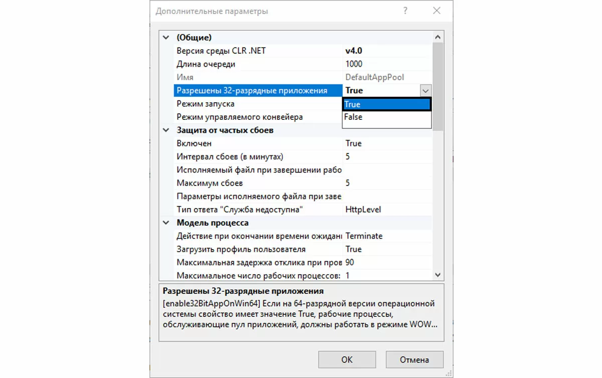 Здесь разрешаем использовать 32-разрядные приложения, установив значение «Ture», т.к. процедура публикации базы на веб-сервер использует 32-разрядный модуль расширения.