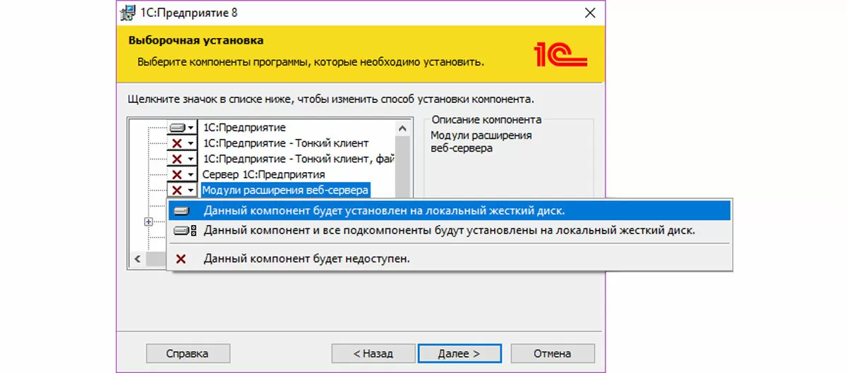 Выбираем и списка «Модуль расширения веб-сервера» и нажимаем кнопку «Далее».
