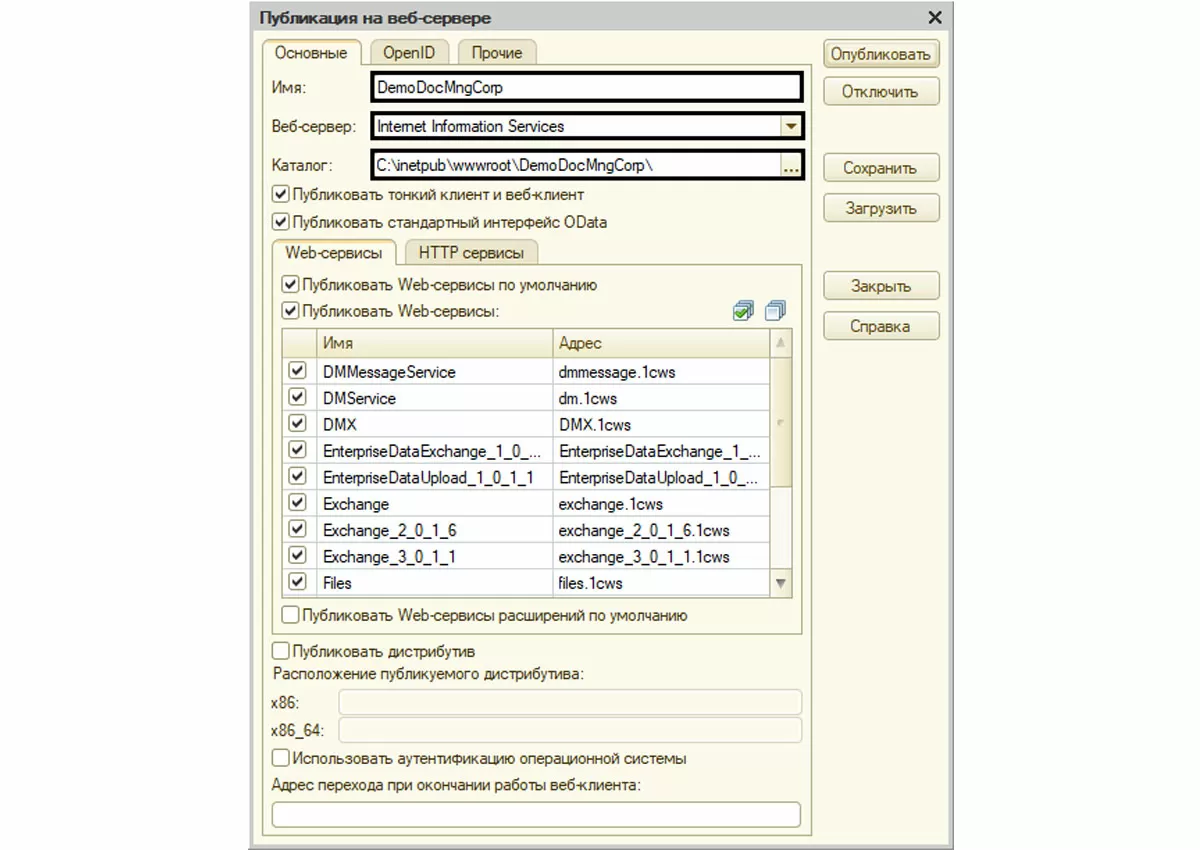 В примере используется демонстрационная база программы 1С:Документооборот. Указываем ее имя (по умолчанию система предлагает свое имя, его можно изменить), веб-сервер отображается автоматически (если установлено несколько веб-серверов, выбираем нужный), а также каталог, где будет храниться база. Остальные параметры оставляем по умолчанию и нажимаем кнопку «Опубликовать».