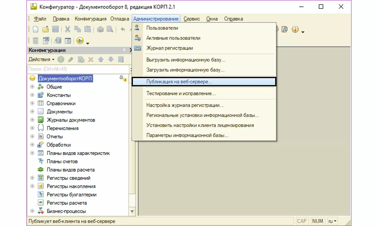 Перейдем в пункт меню «Администрирование-Публикация на веб-сервере...».