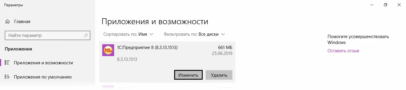 Для установки модулей необходимо или запустить установку платформы, или изменить имеющуюся установку и активировать соответствующий компонент. В нашем примере программа уже установлена, поэтому мы ищем в разделе «Приложения и возможности» (в другом варианте операционной системы может быть «Программы и компоненты») программу 1С в списке установленных компонент и нажимаем кнопку «Изменить».