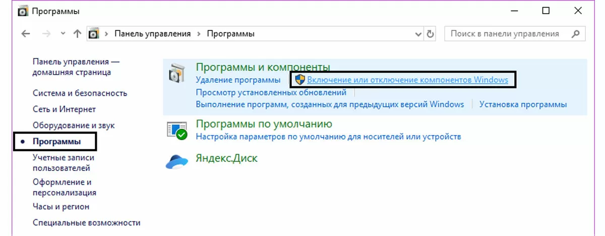 На примере операционной системы Windows 10 рассмотрим запуск IIS. Для этого перейдем в «Панель управления», выбрать пункт «Программы и компоненты-Включение или отключение компонентов Windows».