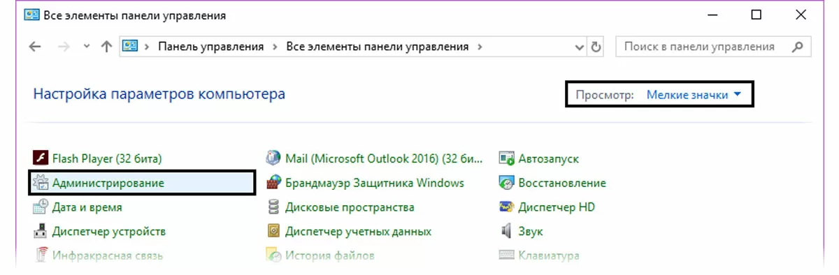 Зайдем в пункт меню «Панель управления-Администрирование». Если вы не видите этот пункт, переключите «Просмотр-Мелкие значки».
