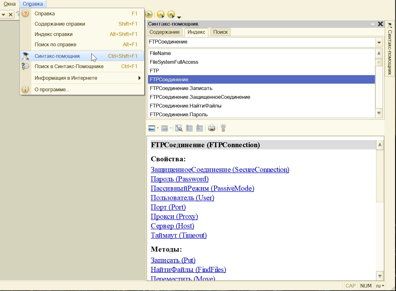 Для того чтобы работать с протоколом FTP в технологическую платформу уже заложены некоторые инструменты. Они доступны в любой конфигурации, если версия вашей платформы 8.3 и выше. Рассмотреть их подробнее, узнать их методы и возможности вы сможете с помощью синтакс-помощника, нажав клавиши CTRL + F1 в конфигураторе. Вот эти объекты: