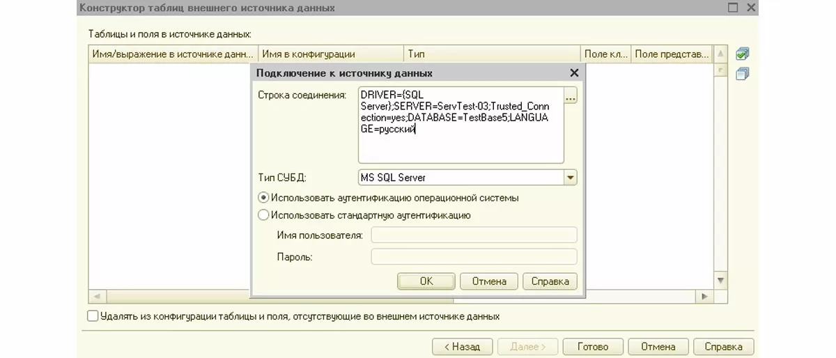 Затем нам надо в разделе «Данные» добавить таблицы, из которых мы будем брать информацию. Разработчики 1С предусмотрели достаточно удобный конструктор, в котором мы можем указать лишь строку соединения и тип СУБД. Для типового подключения к таблице MS SQL используется строка по следующему шаблону: «DRIVER={SQL Server};SERVER=_NameServ_;Trusted_Connection=yes;DATABASE=_NameBase_;LANGUAGE=русский». Вместо «_NameServ_» и «_NameBase_» необходимо вставить имя сервера и базы данных, соответственно.