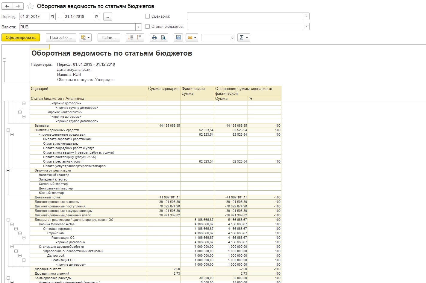 Оценка исполнения плана осуществляется через «Оборотно-сальдовую ведомость по статьям бюджета», подсистема «Бюджетирования и планирования», где можно сравнить запланированные показатели с их исполнением за период.