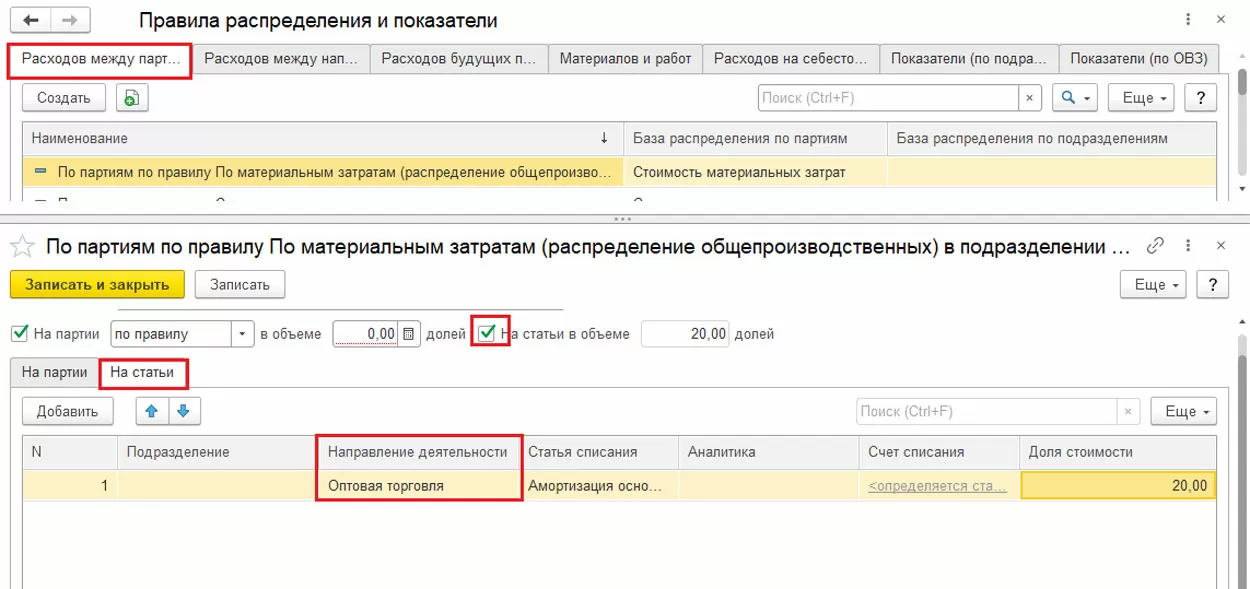Настройка статей расходов позволяет задать вариант распределения для постатейных затрат (через настройку правил распределения по партиям, когда правило – распределить на статью).