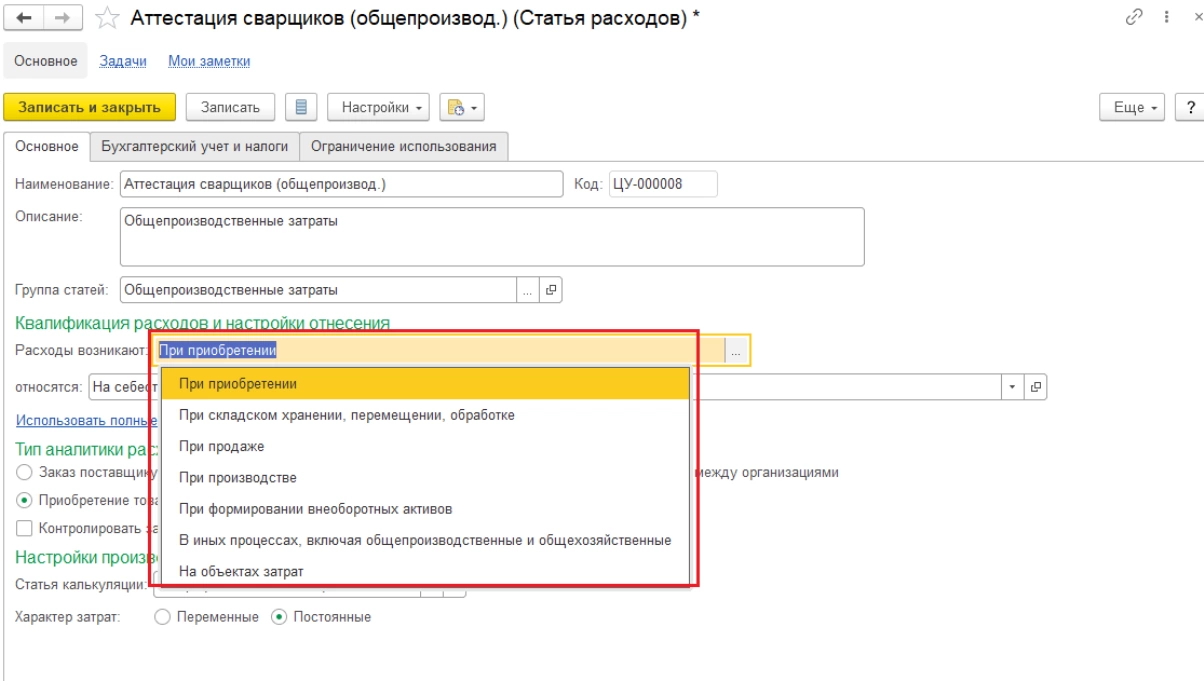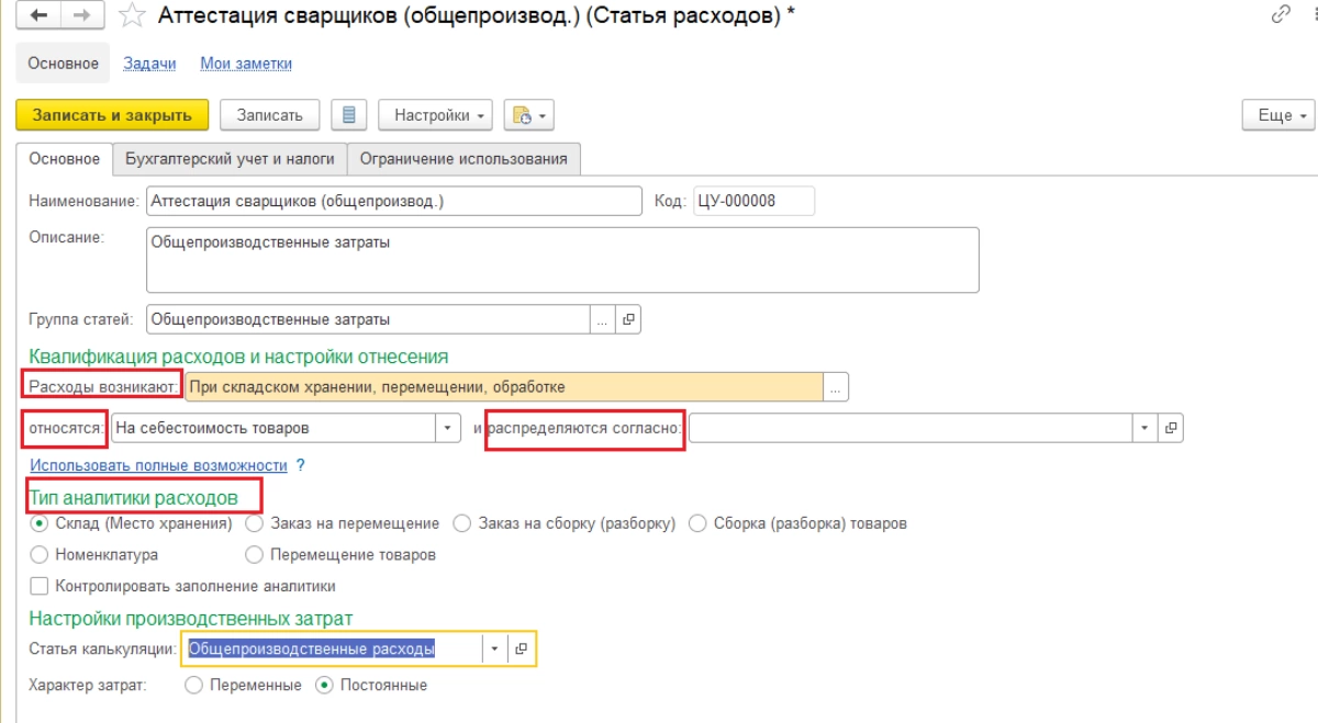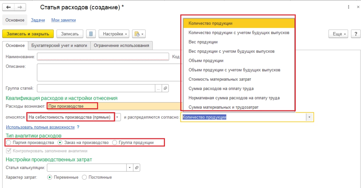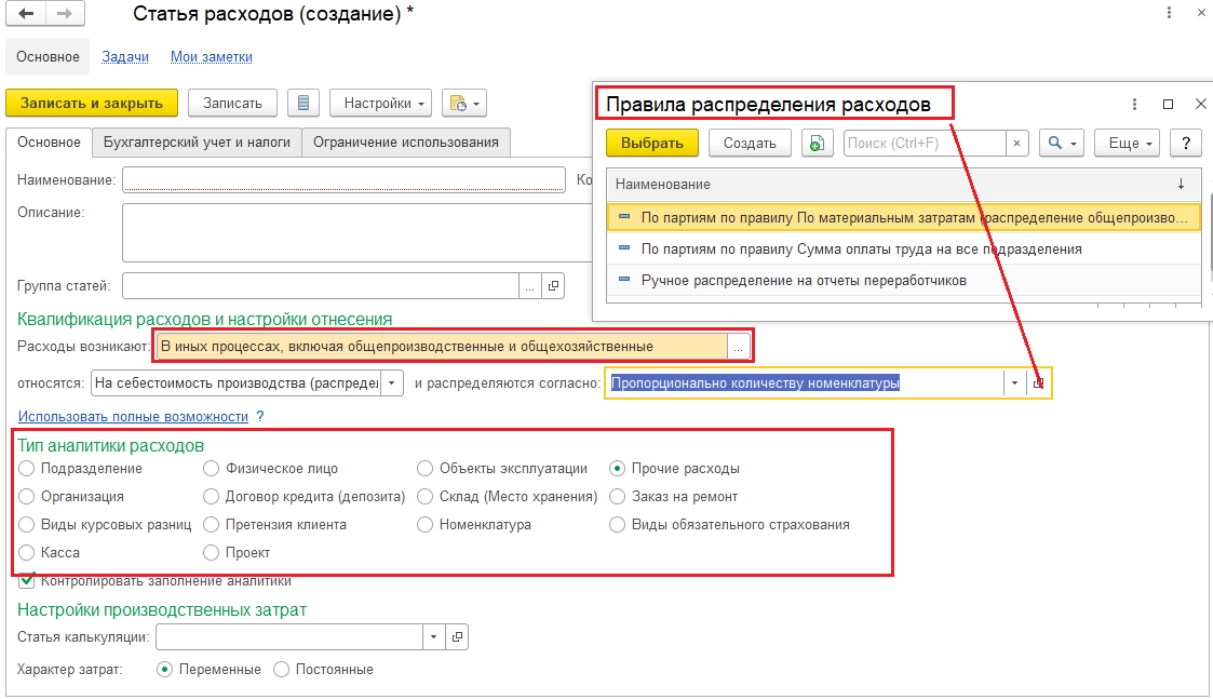 Статья расходов – это основной механизм фиксации и распределения постатейных затрат. При создании статьи расходов важно выбрать два показателя – где расходы возникают и куда они должны относится, на основании которых появляются необходимые для них виды аналитик и правил распределения.