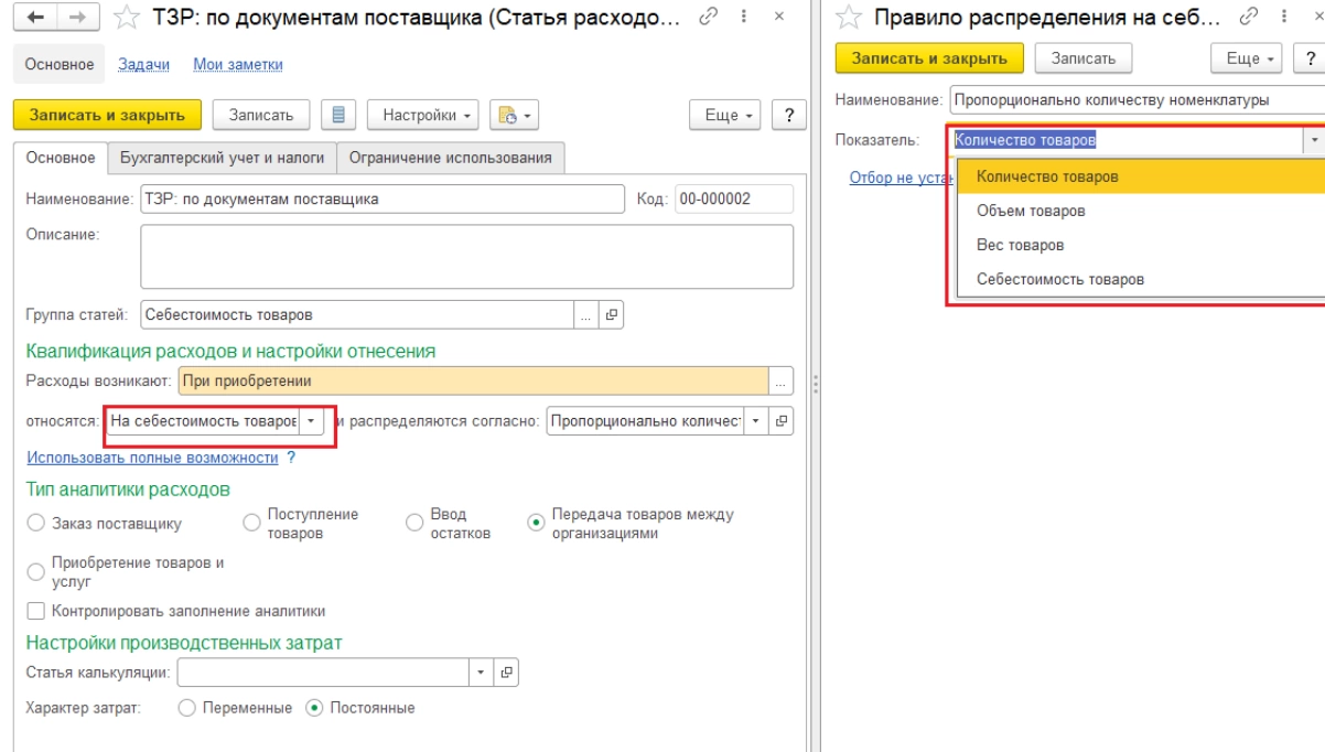 Для распределения стоимости дополнительных расходов на стоимость номенклатуры (например, ТЗР) в статье расходов выбирают тип возникновения: или при поступлении, или при складском хранении, перемещении или обработке; а также способ распределения расходов на себестоимость продукции. При этом возможно несколько вариантов распределения согласно правилам: по количеству, объему, весу или по S товаров.