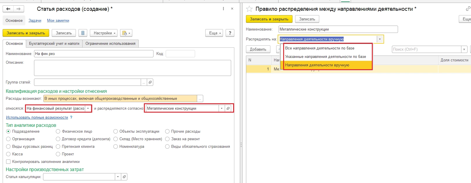 - когда необходимо на производство списать прямые расходы согласно заданным параметрам. Распределение осуществляется в данном случае на выбранные аналитики пропорционально указанным базам.