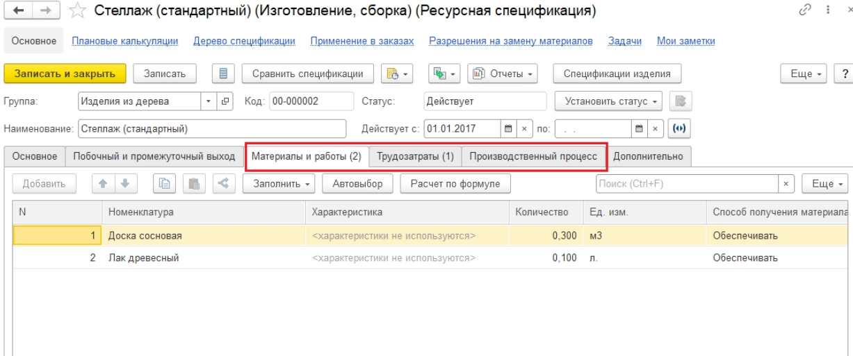 На этом этапе происходит формирование S готовой продукции (ГП), посредством списания номенклатурных и постатейных затрат на ее стоимость. Номенклатурные затраты и трудозатраты калькулируются в документах «Выполнения этапов» и «Производства без заказа». Списание сырья в них производится согласно карточке «Ресурсная спецификация», которая представляет собой калькуляцию (рецептуру) будущей продукции и включает список сырья и работ для производства, трудозатраты на выпуск и описание этапов производственного процесса.
