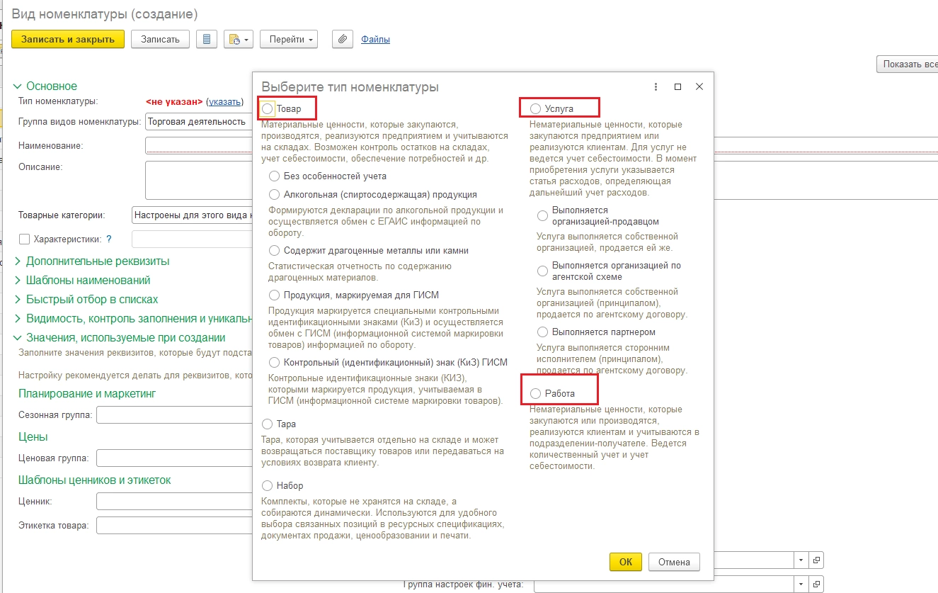 В 1С:ERP имеются три типа номенклатуры – товары, работы и услуги.