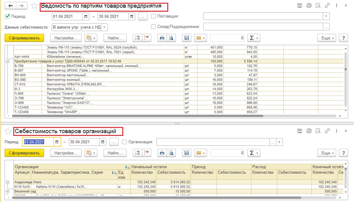 - «Ведомость по партиям товаров предприятия» позволяет мониторить поступление и списание партий товаров, а также распределение расходов через партионный учет.