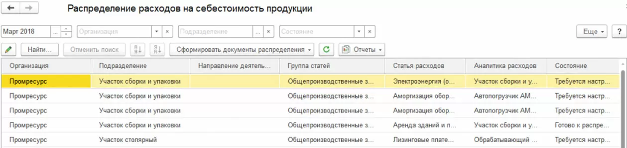 Само занесение таких трат на себестоимость выполняется в ходе действия процедуры закрытия месяца, совместно с операцией «Распределение доходов и расходов по направлениям деятельности».