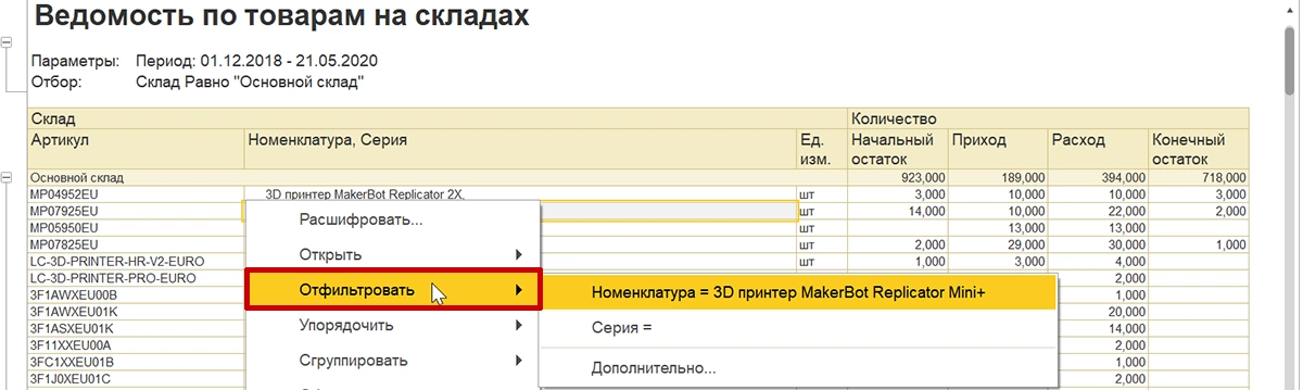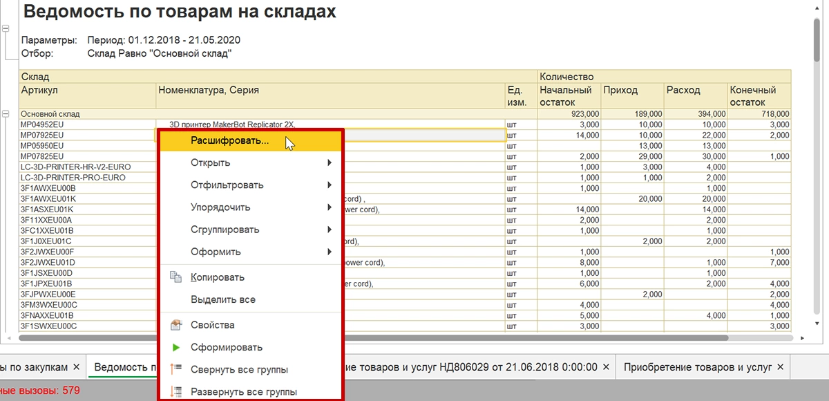 Типовой функционал позволяет открыть из отчета соответствующие справочники, документы-регистраторы и другую информацию. Наведя на ячейку курсором мышки, можно увидеть, возможна ли для не расшифровка. Если дополнительные действия по расшифровке доступны, то иконка курсора изменит свой вид.