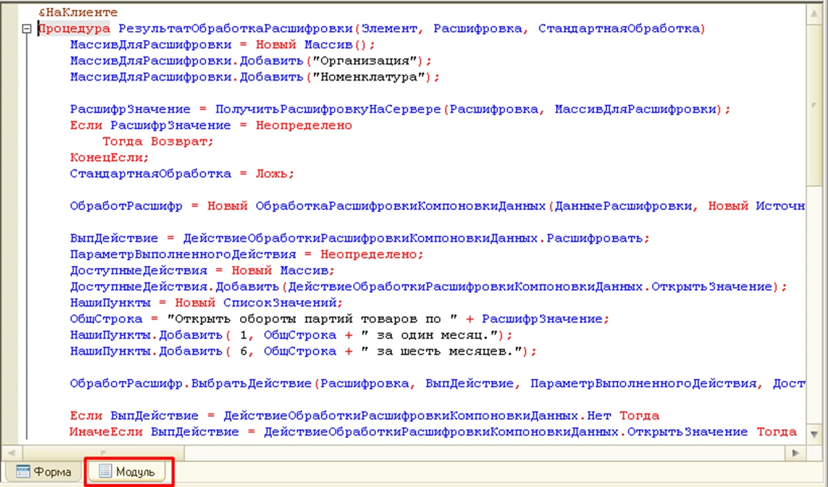 Для начала в модуле формы отчета в процедуре РезультатОбработкаРасшифровки описываем получение полей, для которых будет выводиться расшифровка: