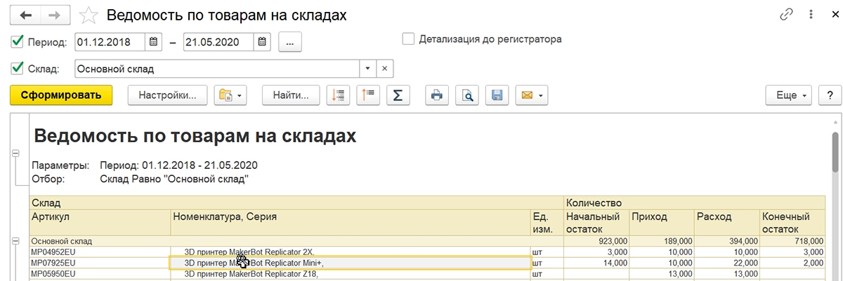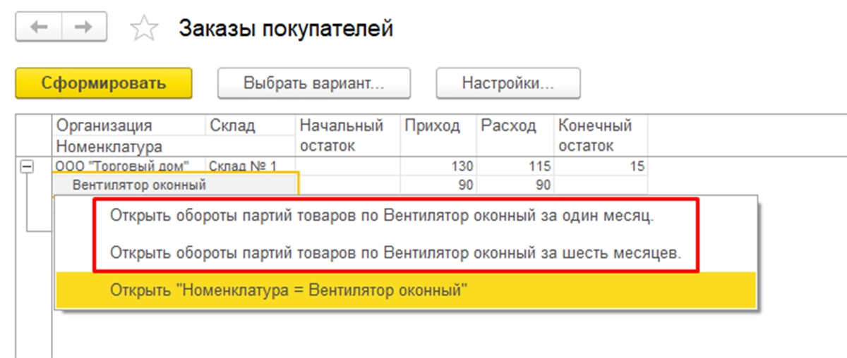 Важным моментом для пользователей является возможность расшифровки данных отчета другим отчетом. Например, пользователь выводит отчет с номенклатурой, которую заказали клиенты. С помощью расшифровки другим отчетом пользователь может увидеть, какое количество этого товара было отгружено, например, за последний месяц.