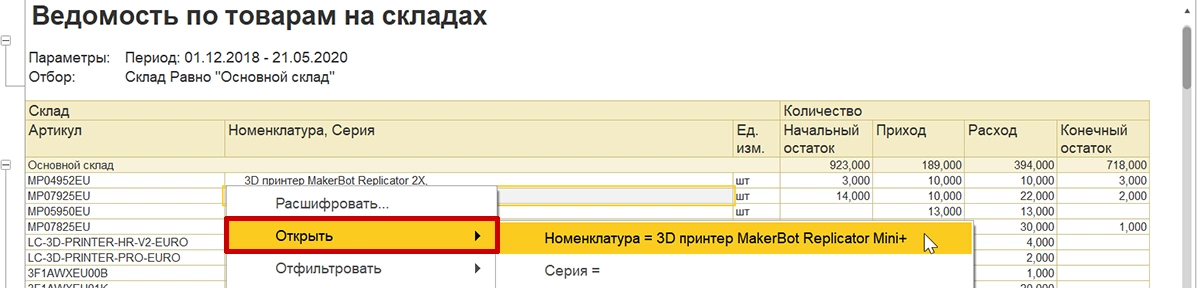 По умолчанию открывается стандартная расшифровка, которая является общей для большинства отчетов конфигурации. Например, если щелкнуть на номенклатуру и в открывшемся окне навести курсор на «Открыть», то можно открыть необходимый элемент справочника номенклатуры, серии или характеристики.