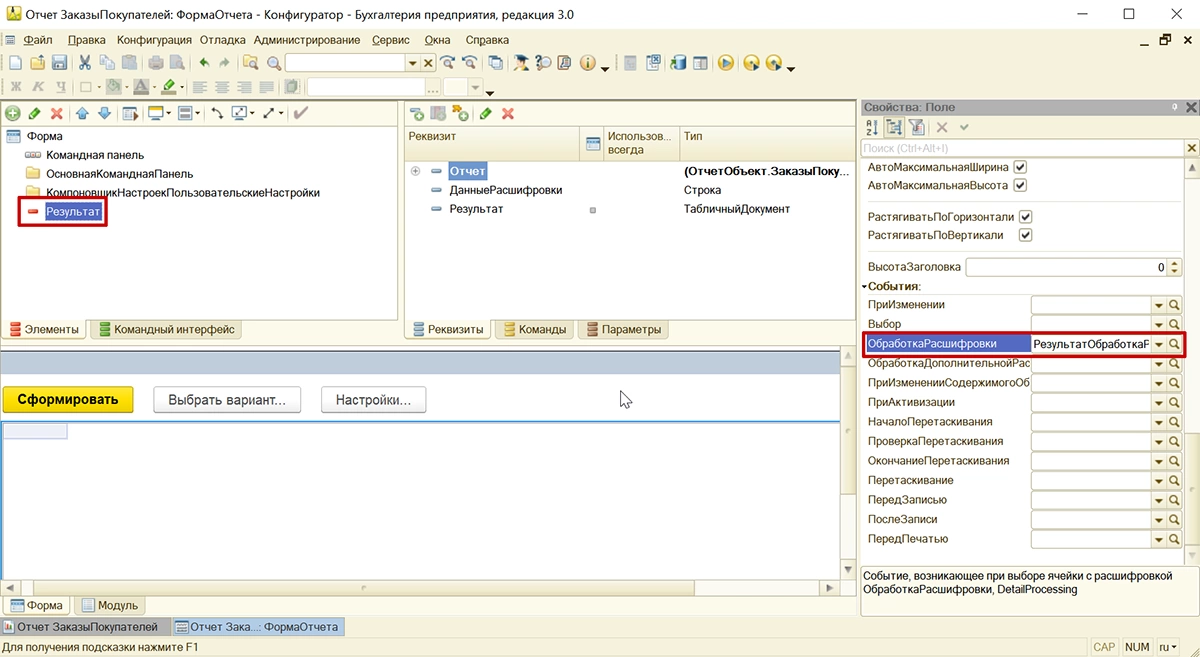 Для реквизита формы «Результат» необходимо заполнить действие «Обработка Расшифровки».