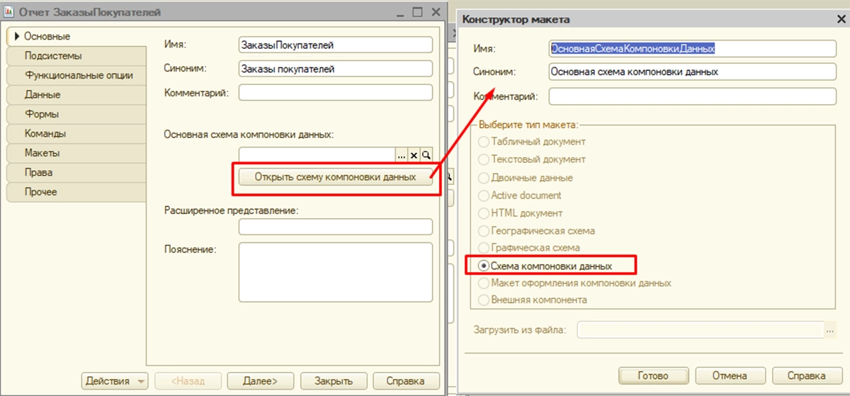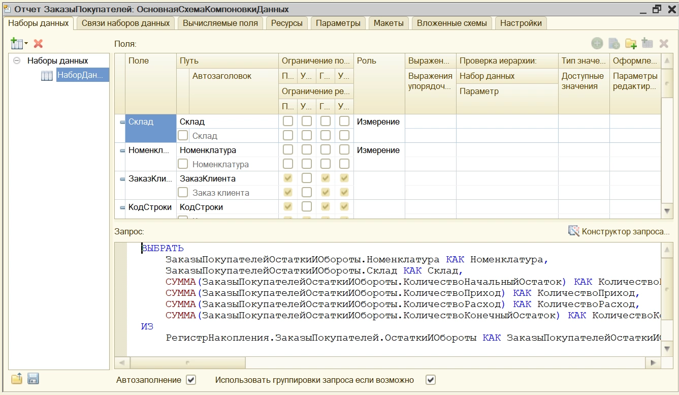 Схема будет храниться в макете. Создаем выборку данных, настраиваем наборы данных и задаем другие настройки, необходимые для корректной работы отчета.