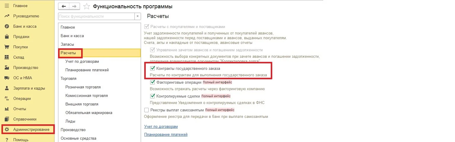 - Включить настройку: Администрирование → Функциональность → Расчеты → Контракты государственного заказа. Эта настройка включает две опции: