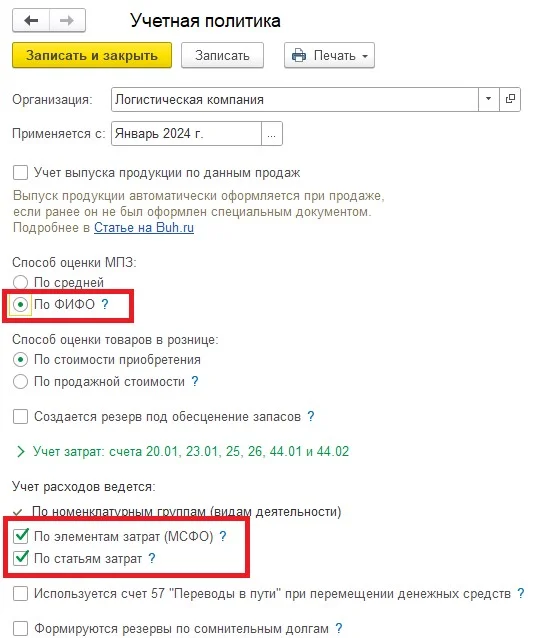 - В настройке учетной политики способом учета запасов выбрать ФИФО. В разделе «Учет расходов ведется» установить признак «По элементам затрат (МСФО)» и/или «По статьям затрат».