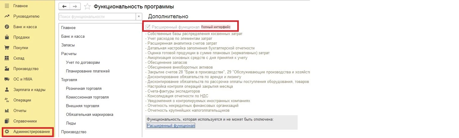 - Включить настройку: Настройки → Функциональность → Дополнительно → Расширенный функционал.