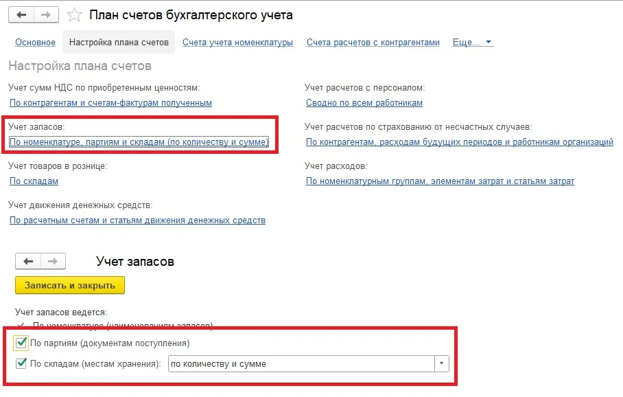 - В параметрах учета плана счетов сделать дополнительные настройки учета запасов: