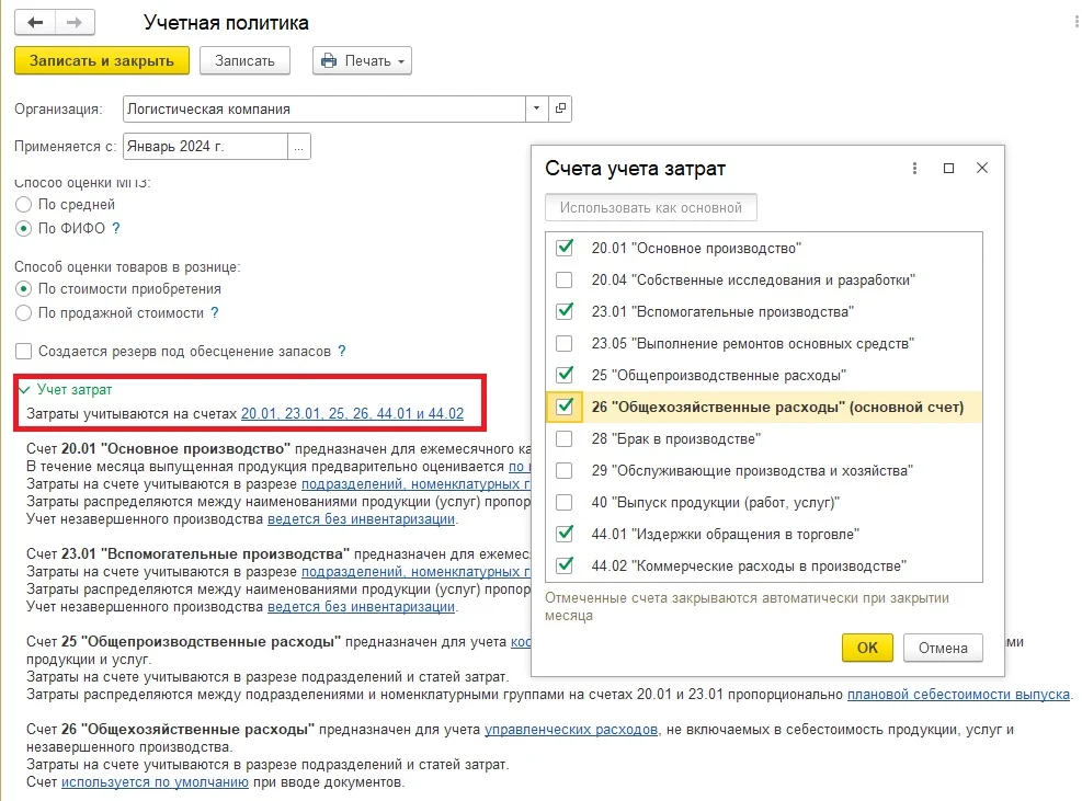 - В настройках учетной политики необходимо перечислить счета учета прямых и косвенных затрат.