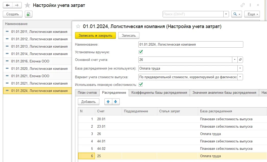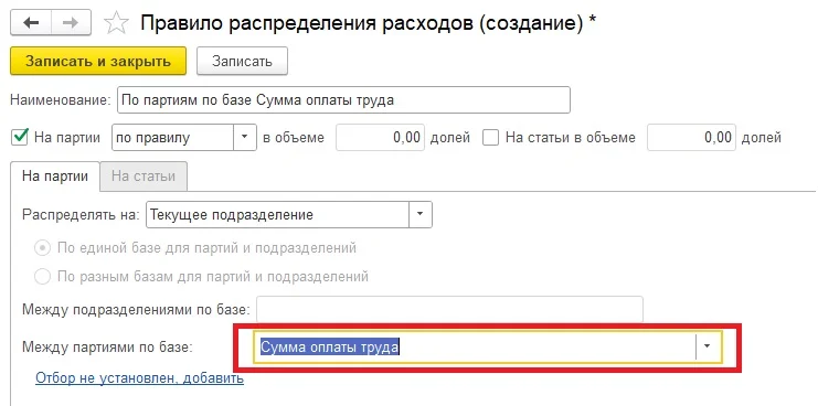 Чаще всего в «Правилах распределения расходов» указывают базу распределения – «Прямые производственные затраты» и показатель – «Сумма оплаты труда».