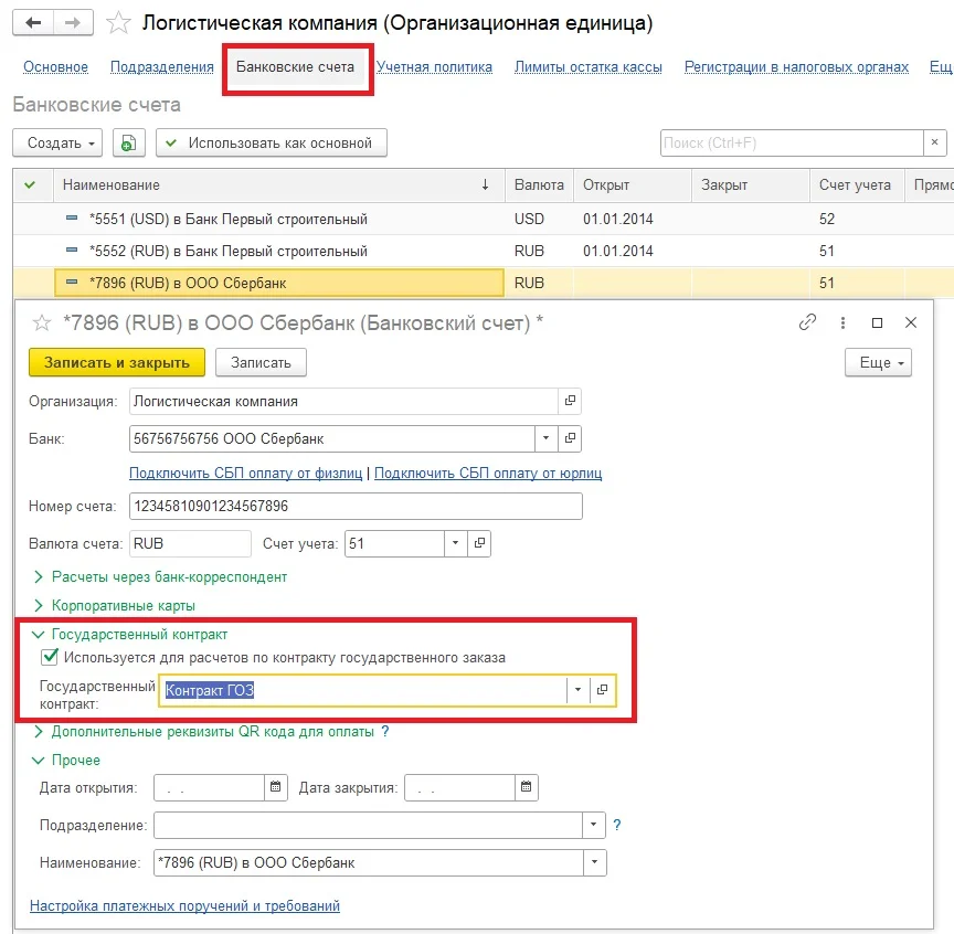 - В банковских счетах по госконтрактам в группе настроек «Государственный контракт» поставить признак «Используется для расчетов по контракту государственного заказа», создать и указать контракт.