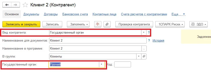 - Для заказчиков по госконтрактам для поля «Вид контрагента» указать «Государственный орган».