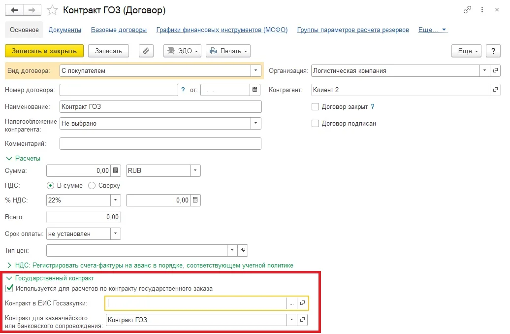 - Для договоров по госконтрактам в группе настроек «Государственный контракт» установить признак «Используется для расчетов по контракту государственного заказа» и указать контракт.