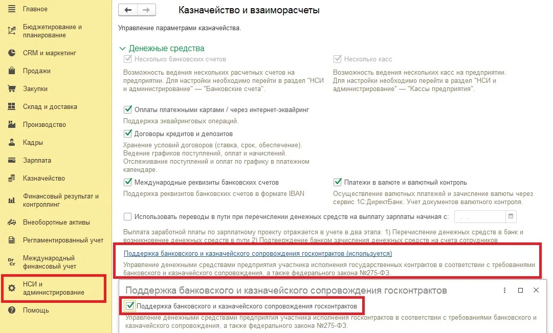 - В блоке «Казначейство» включите «Поддержка платежей в соответствии с 275-ФЗ».