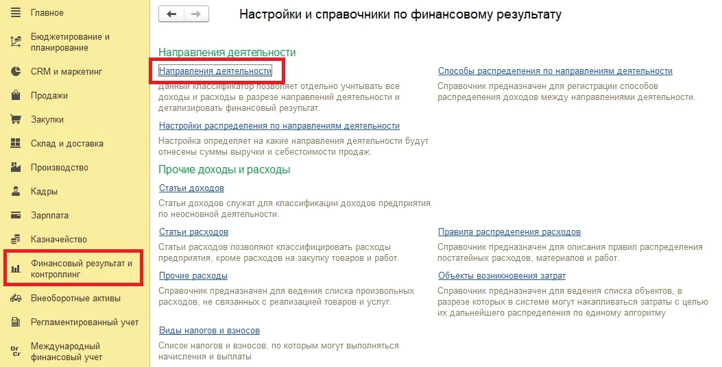 - В блоке «Справочники и настройки» выберите «Направления деятельности».