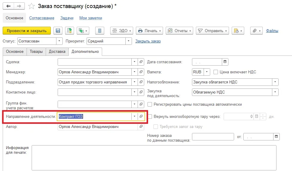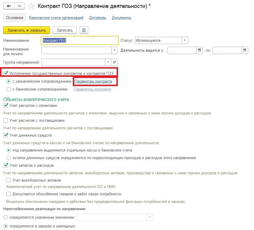 При создании документов (поступление материалов, начисление зарплаты, выпуск продукции) всегда заполняйте реквизит «Направление деятельности». Без него система не поймет, к какому контракту относить операцию.